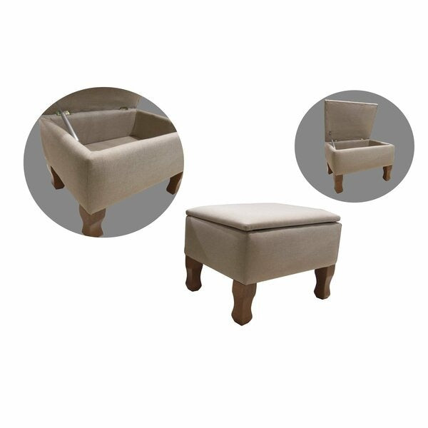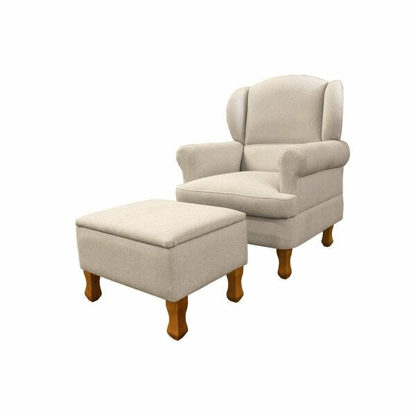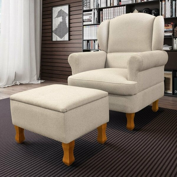 Cadeira de Amamentação com Puff Baú Estofada em Linho Bege com Pés de Madeira